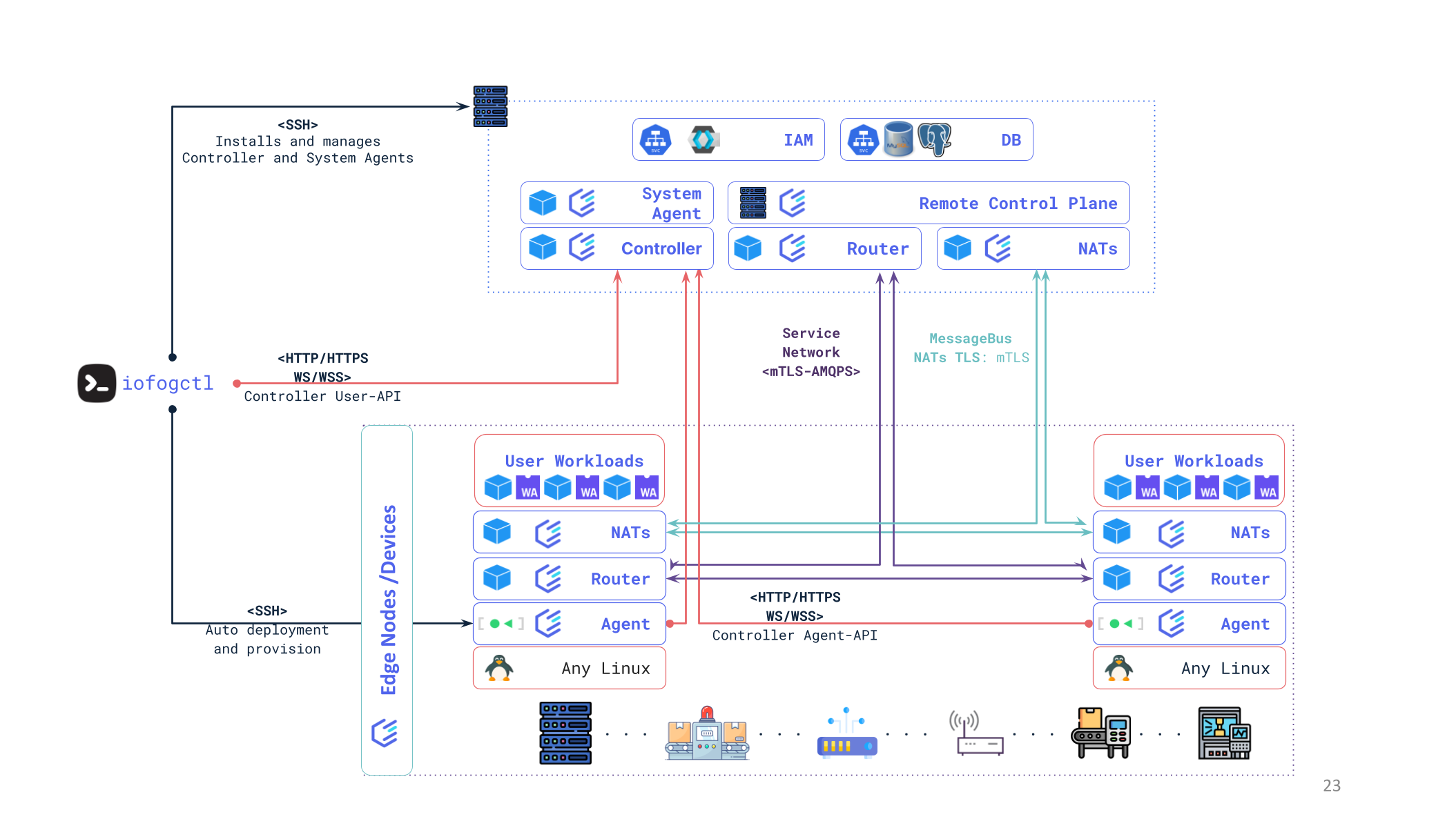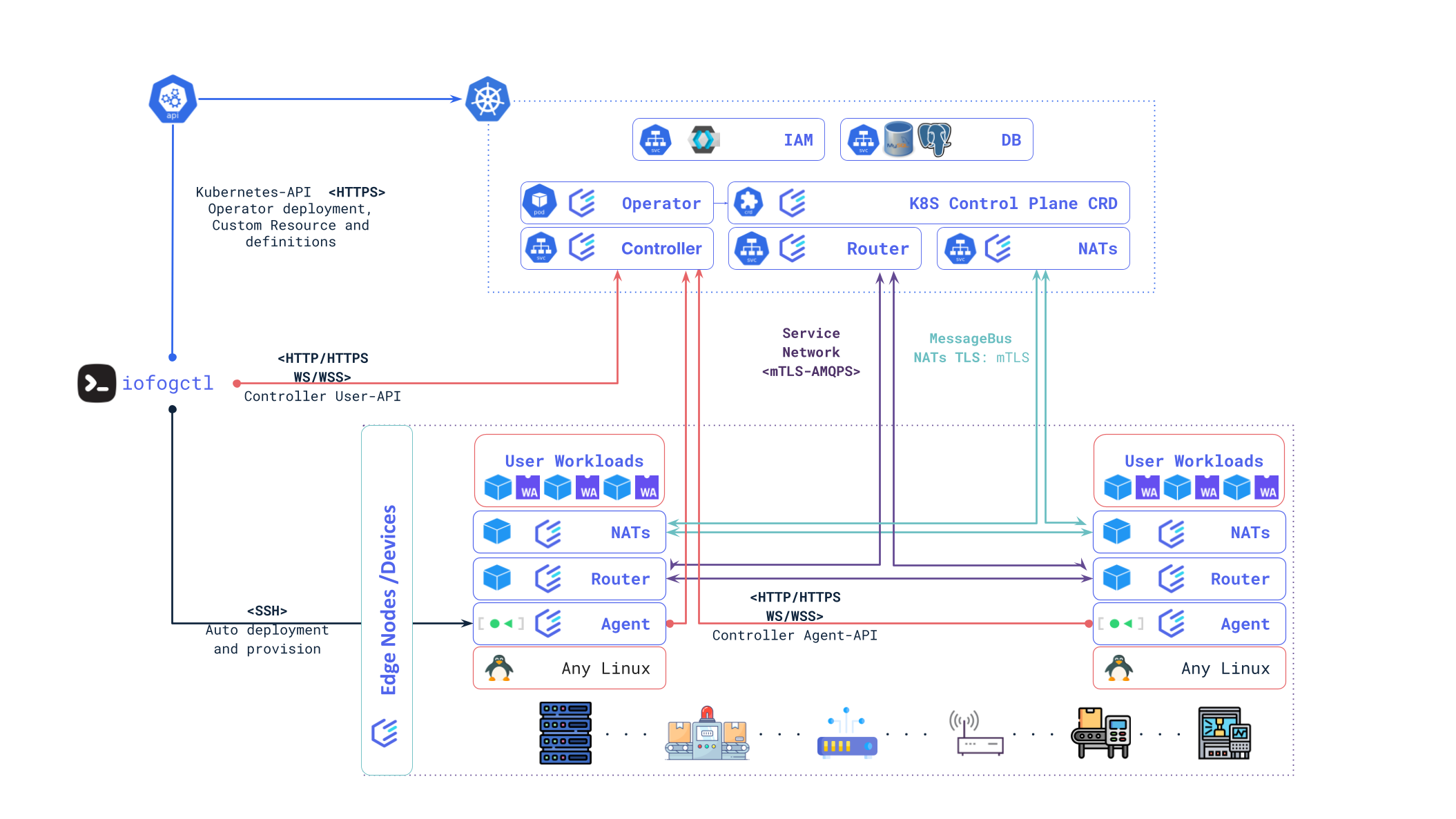 ioFog provides a single point of control to securely deploy, operate and govern software container workloads across large and diverse edge environments. It brings cloud-native operating principles to the edge by abstracting the complexities of deploying and managing the entire lifecycle of edge workloads while building secure service mesh and distributed messageBus within edge clusters. Therefore, enterprises only focus on innovation rather than infrastructure, security and networking.