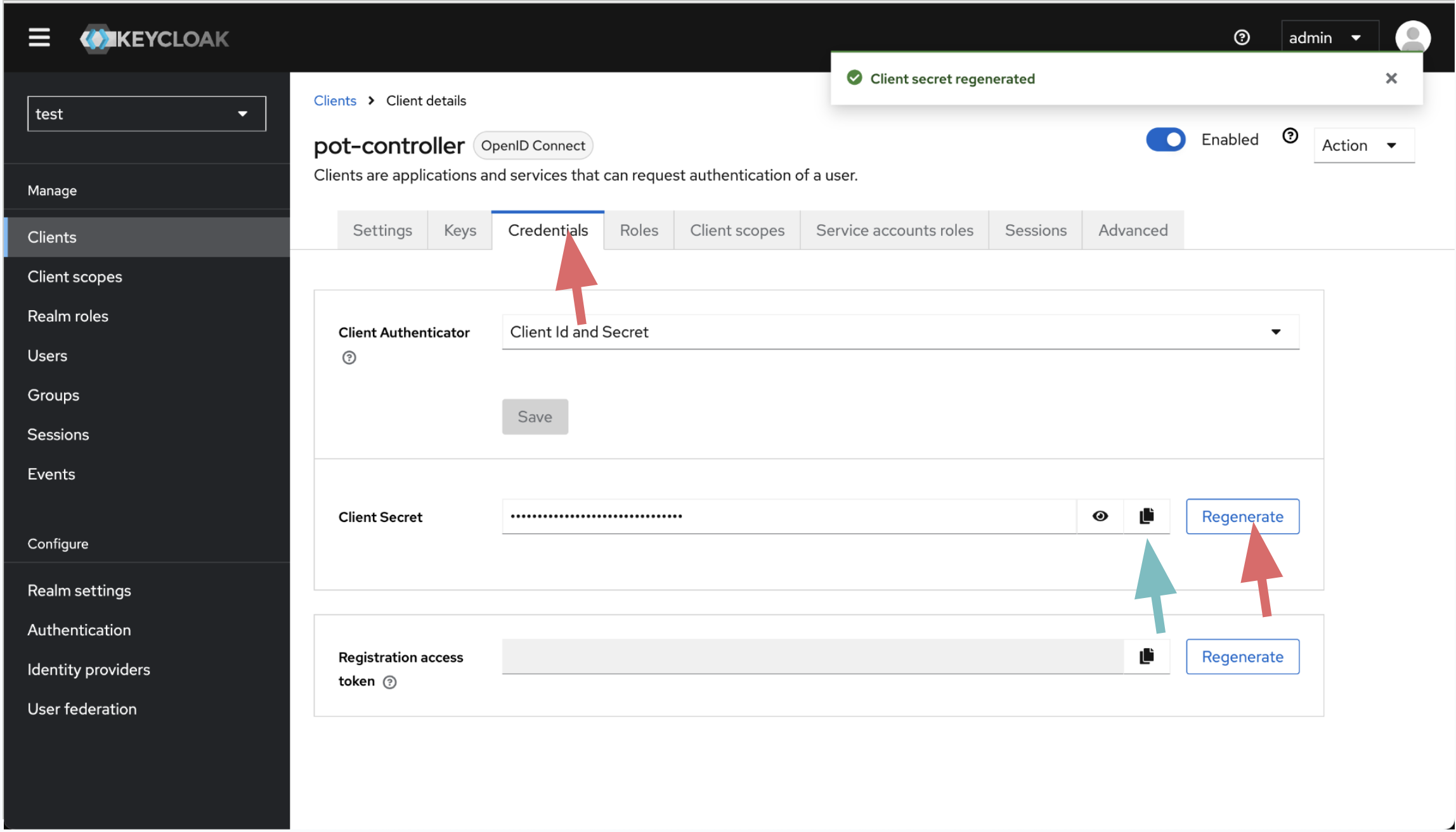 Generate client secret for pot-controller client. Copy and save it, you wil use it while preparing ControlPlane yaml.