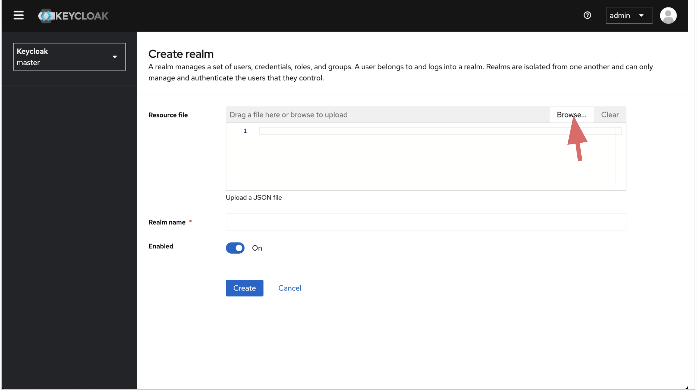 wget -q -O - "https://iofog.org/iofog-realm-template.json" | sed 's/\$realm/newRealmValue/g' > datasance-pot-ralm.jsonwget -q -O - "https://iofog.org/iofog-realm-template.json" | sed 's/\$realm/test/g' > datasance-pot-realm.jsonImport the preconfigured realm json you download in previous step.