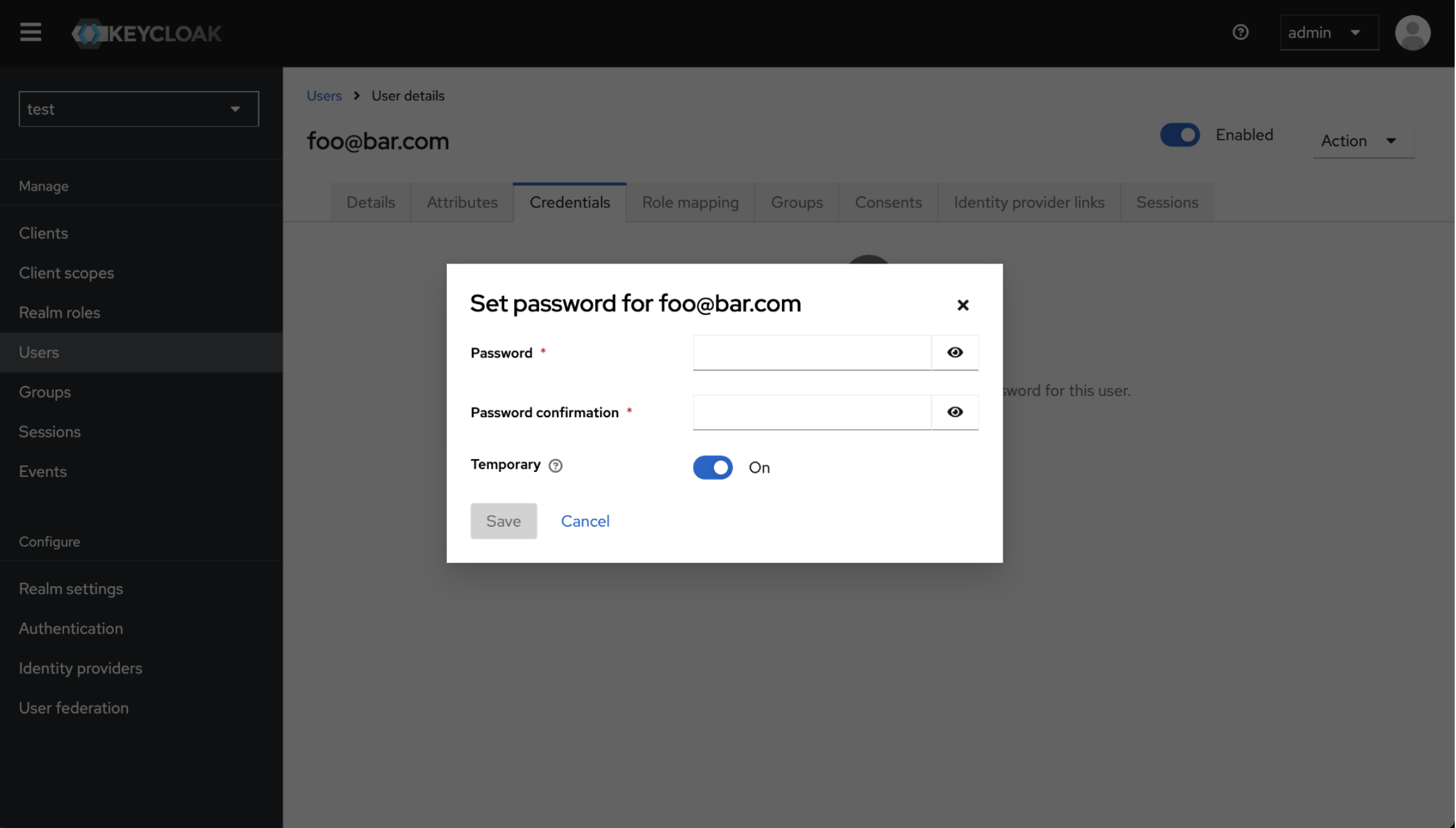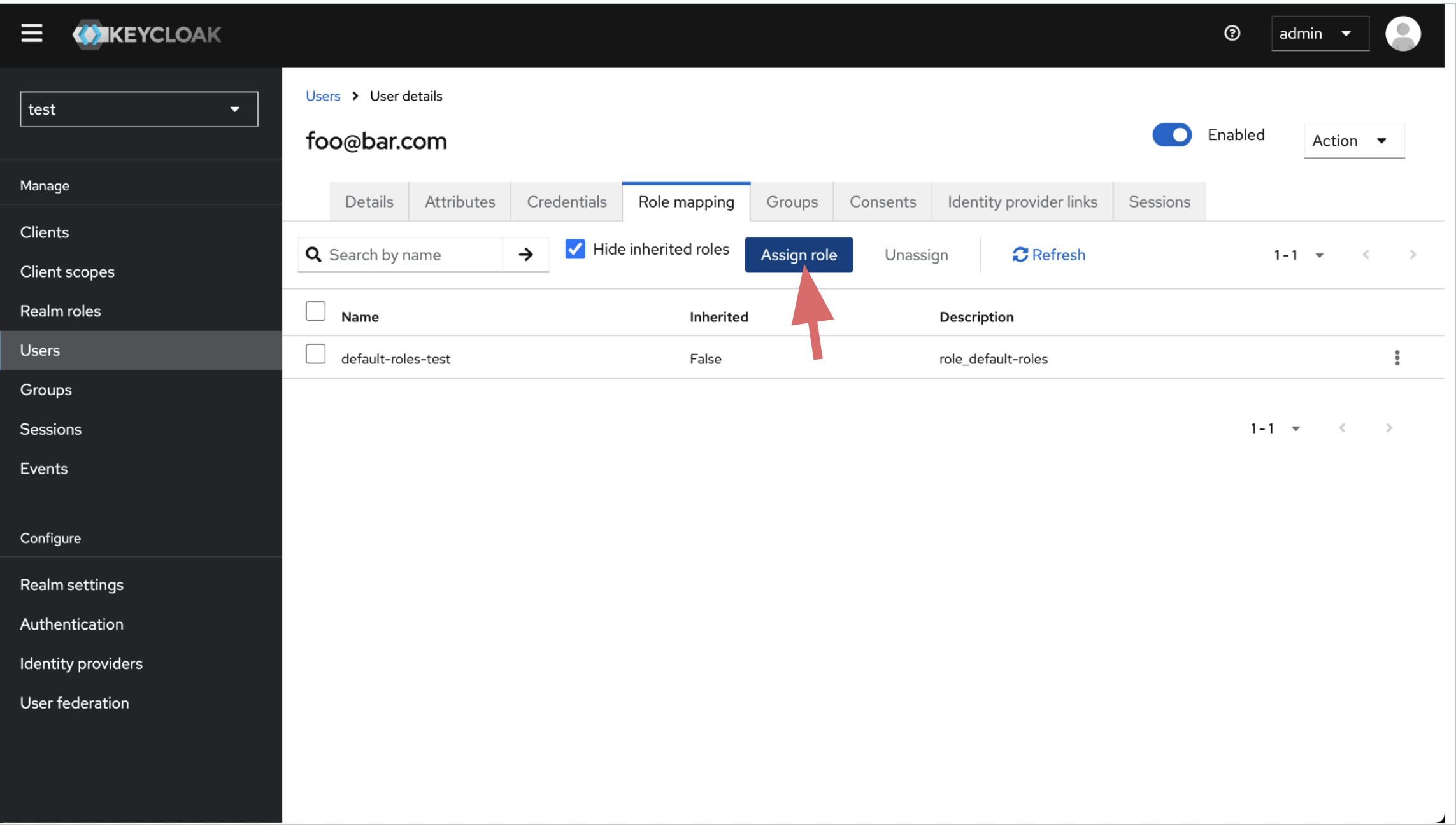 Create user inside imported realm. Create user's password and assign role.
