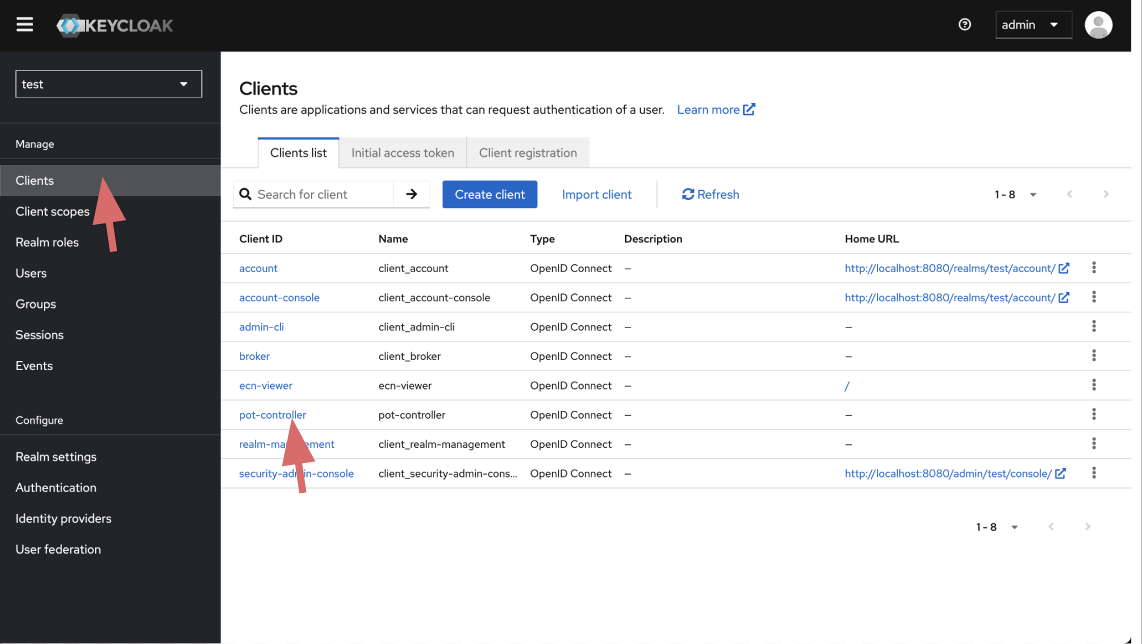 ecn-viewerclient comes with Standard Flow , pot-controller client comes with Direct access grants and Service accounts roles